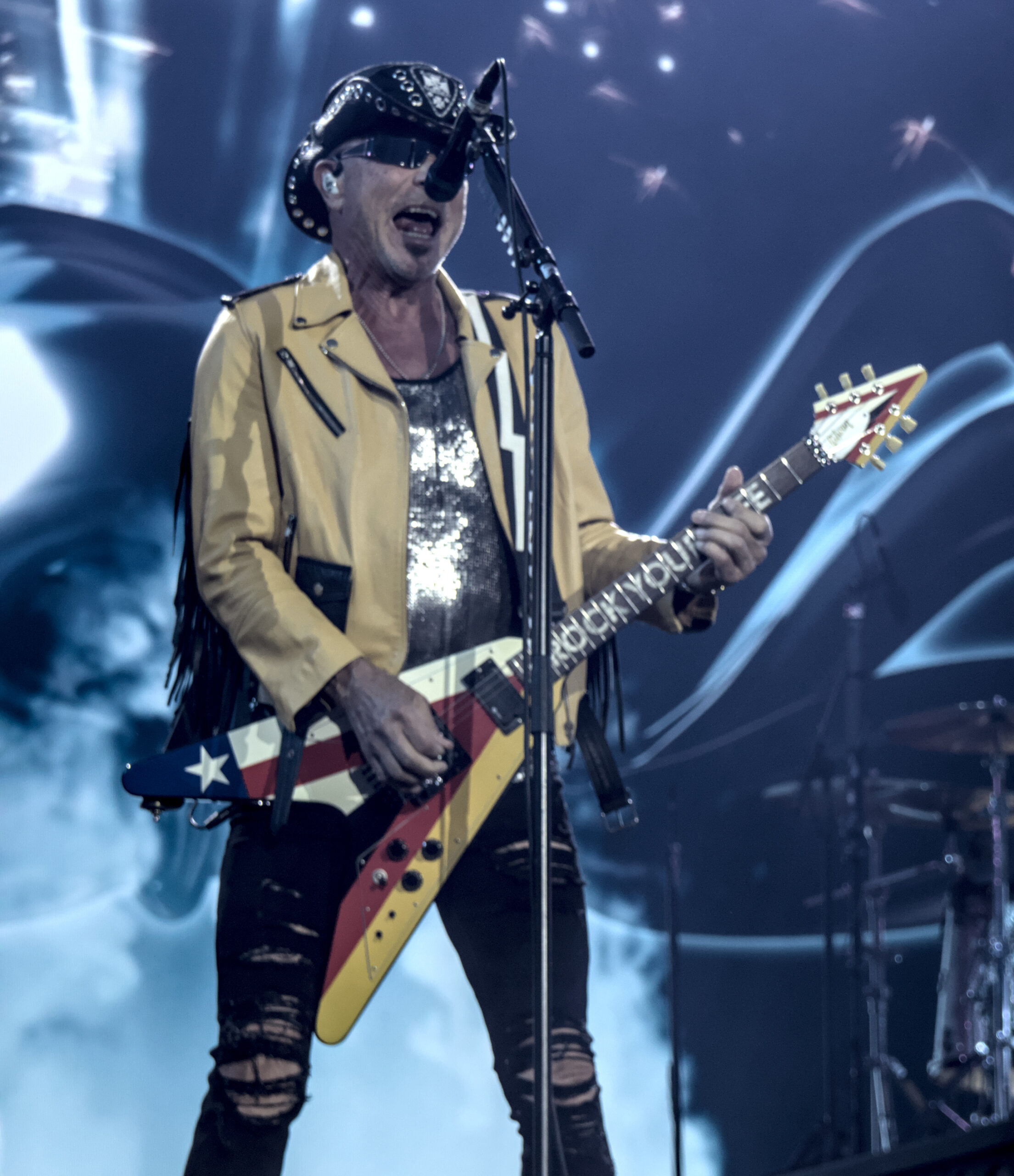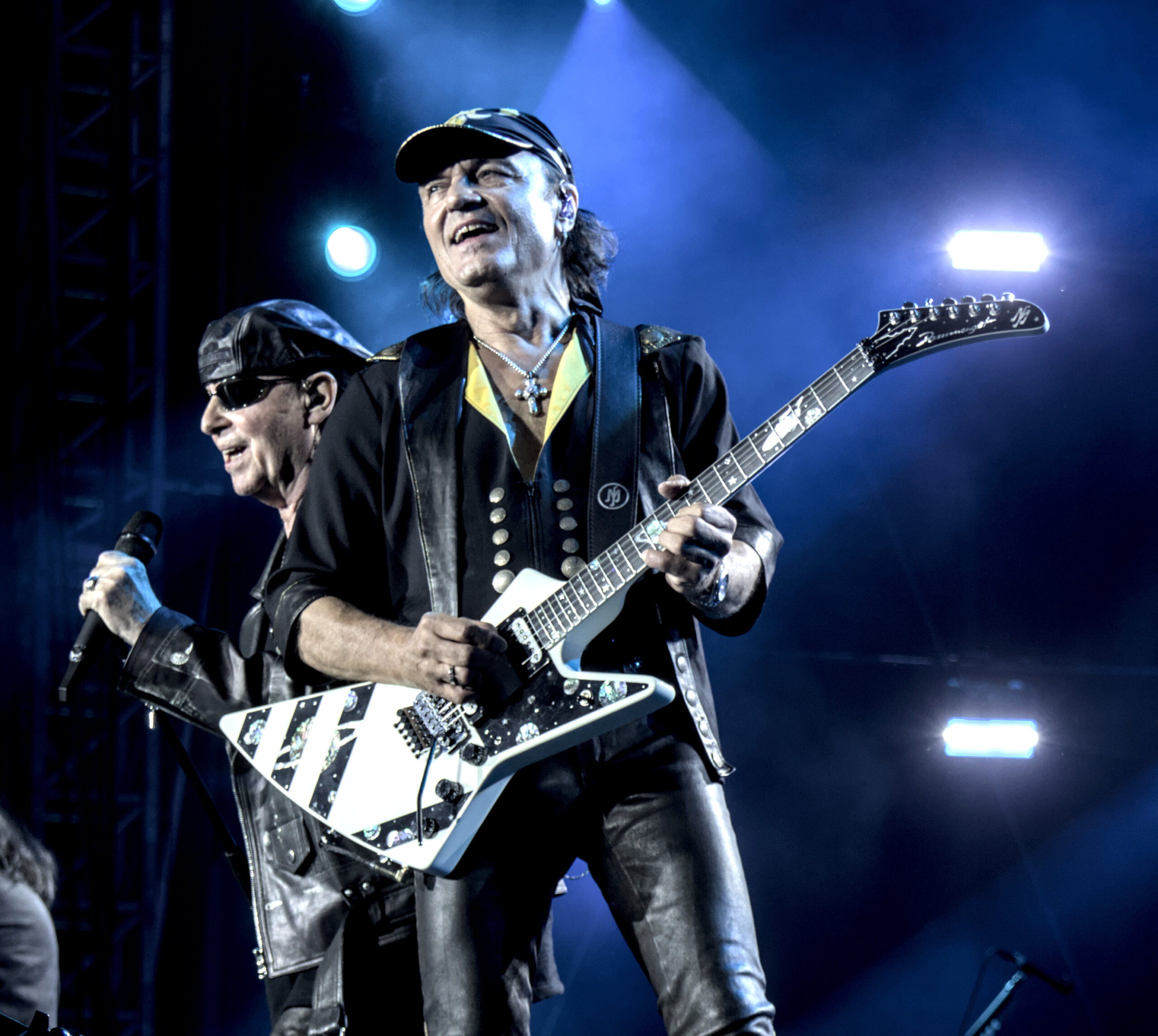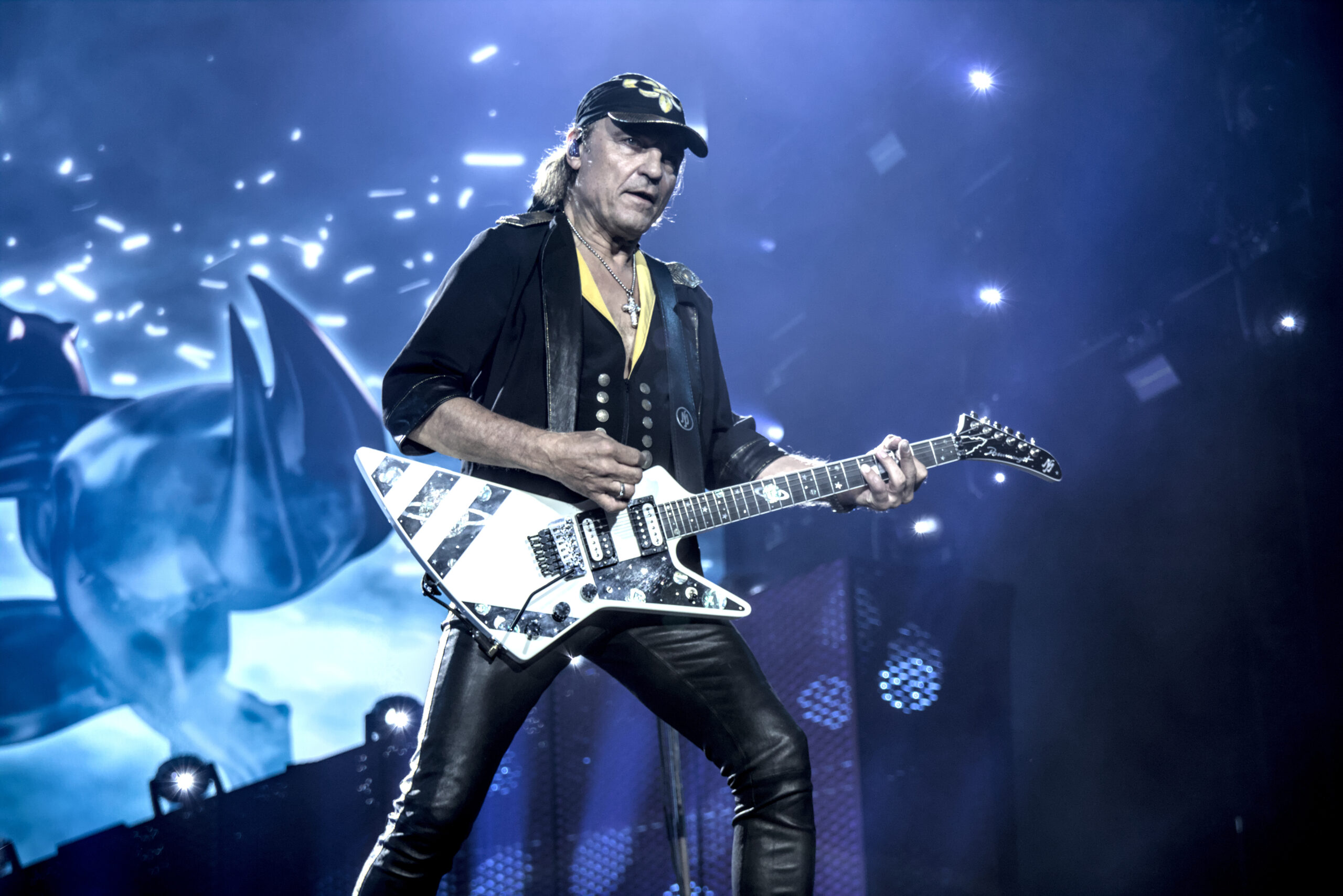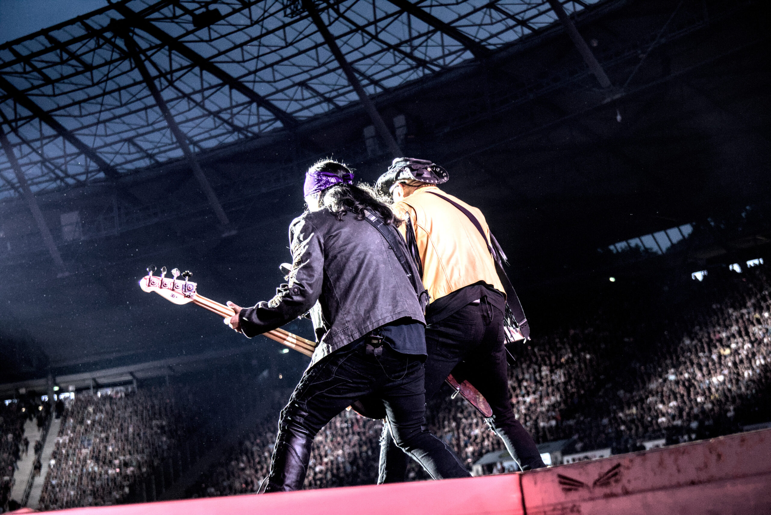 Gegen 21:50 Uhr war es dann Zeit für die Sorpions. Etwas später als geplant. Die Wartezeit wurde mit Laolawellen durchs gesamte Stadion verkürzt. Nach einem Rückblick auf der Videowall mit den größten Momenten der Band starteten die Scorpions mit „Coming Home“ in Ihr erstes Stadionkonzert in ihrer Heimatstadt Hannover. Sänger Klaus Meine sagte dazu “Es war eine lange Reise von Sarstedt bis in die Heinz von Heiden Arena“. Damit hatte er Recht, und das Publikum bestätigte das durch lauten Applaus. Während der Songs brachten die Gitarristen Rudolf Schenker und Matthias Jabs sowie Bassist Pawel Mąciwoda ordentlich Bewegung auf die Bühne während Mikkey Dee dazu den Takt vorgab. Klaus Meine ist nicht mehr ganz so gut zu Fuß, aber überzeugte mit seiner einzigartigen Stimme.