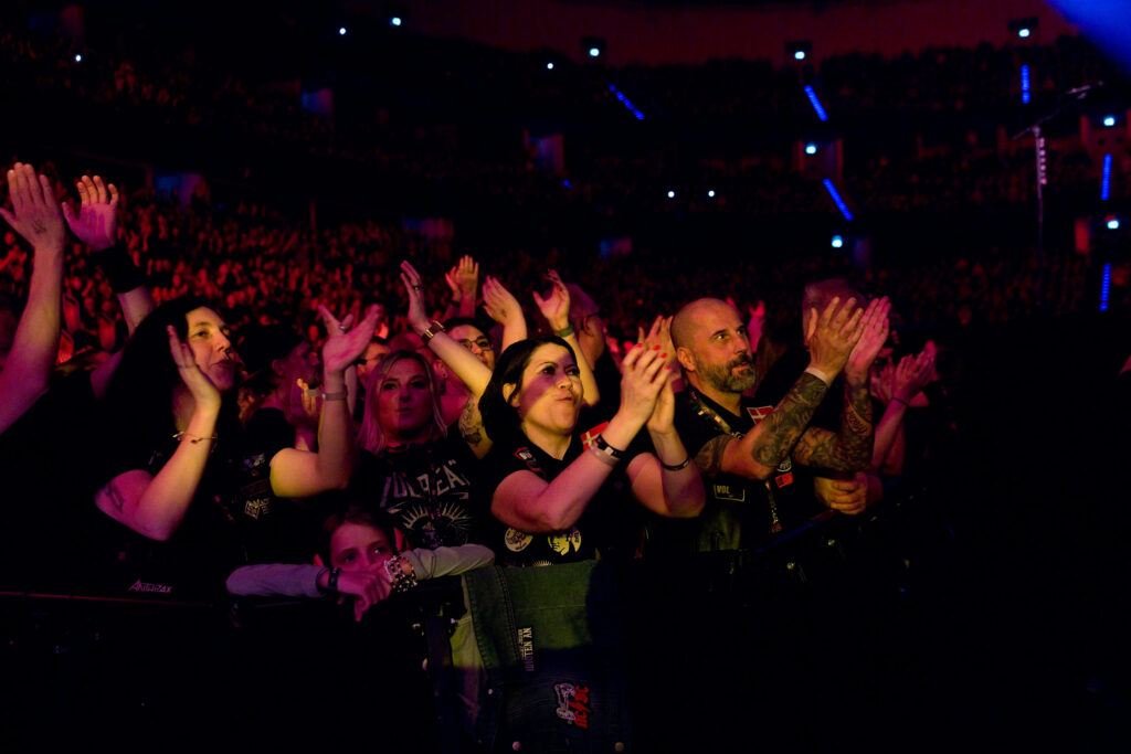 Gut gelöst hat die Band die Bühnensituation. Die Hauptbühne wurde nach vorne raus mit einer Bühne in Pfeilform ergänzt. Frontmann Michael konnte so jeder Seite der Halle seine Aufmerksamkeit schenken. Ein Fan aus dem Publikum bekam besondere Aufmerksamkeit: Gerne wollte er Schlagzeug spielen. Leider war das aus Sicherheitsgründen nicht möglich. Aber als Entschädigung bekam er das von Michael Poulsen persönlich getragene Schweißaramband. Insgesamt wurde das Publikum gut eingebunden. Es wurde zum Crowdsurfen aufgerufen und der- oder diejenige welche sich als erstes nach vorne durchsurft bekommt ein T-Shirt. Das hat auf jeden Fall funktioniert. Es fanden sich schnell ein paar die sich der Herausforderung stellten.