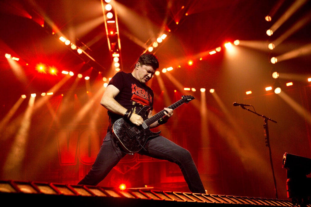 Nächster Umbau. Wieder eine halbe Stunde. Wieder Zeit zum austauschen. Die Halle ist jetzt komplett voll, die Lautstärke der Gespräche ist enorm. Der ein oder andere hat schon ein Bierchen zuviel verzehrt. Kurz nach 21 Uhr legen Volbeat los mit „Devils Bleeding Crown“. Es werden keine Gefangenen gemacht, es geht sofort richtig ab. Licht, Sound, Stimmung. Es passt einfach alles.